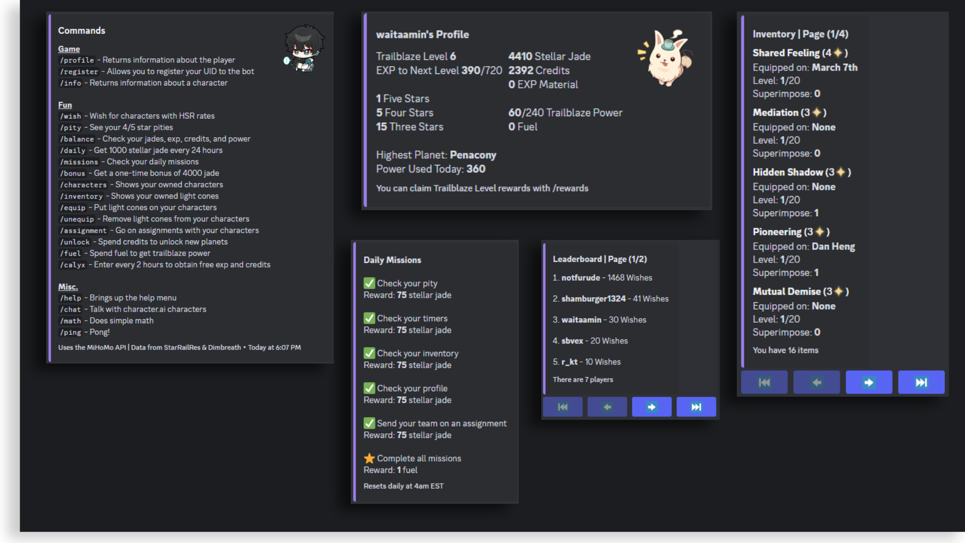 Seele is a Discord bot I spent the Winter of 2023 working on. The original purpose for this project was to pull profile data from a video game that I routinely played using their API. However, since the commands were very barebones and simple, I wanted to expand the project to involve more interactivity with the user. This led to me creating a whole game within the Discord bot that simulated the video game that I took inspiration from. I was able to create a fully-fledged bot that has an economy system, various mini-games, and daily login rewards to keep the players interested. This project helped me learn a lot about Javascript, as well as how to structure a database schema. In addition, I had to learn various parts of Discord’s API and how bot messages are built, since they’re different from user messages.
